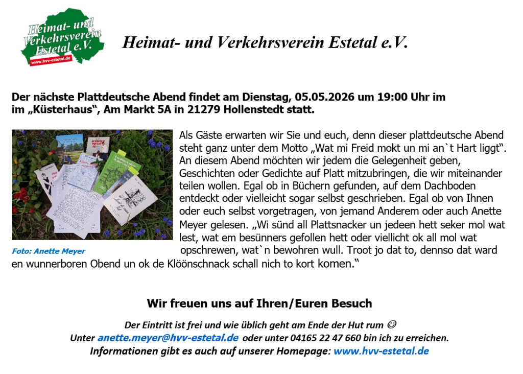 In unserem Vereinsmagazin DER ESTETALER Nr. 29 vom Februar 2026 hatten wir alle Plattdeutsch-Feunde zu einer Ausfahrt im Juni auf die „Peking“ eingeladen. Leider sind schon jetzt alle Plätze vergeben – eine Warteliste ist aber eingerichtet. Interessenten erkundigen sich bitte kurzfristig bei den angegebenen Adressen.