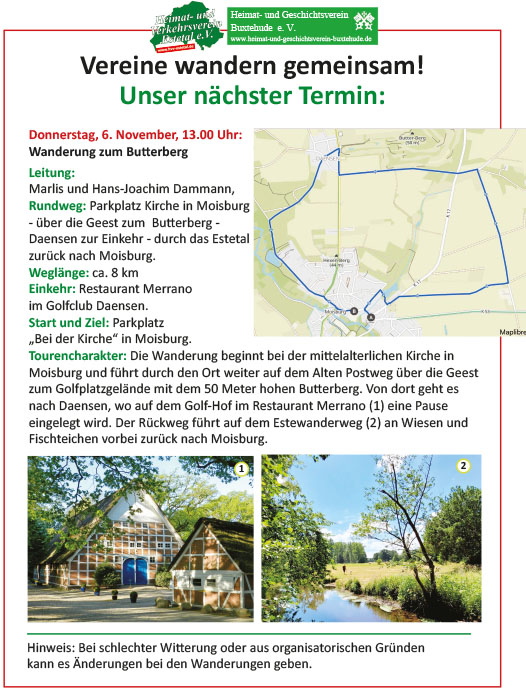 Wie in den letzten Jahren, bieten der Heimat- und Verkehrsverein Estetal und der Heimat- und Geschichtsverein Buxtehude geführte Wanderungen in der Este-Region an. Bei allen Wanderungen wird unterwegs eine längere Pause mit Einkehrmöglichkeit eingelegt. Eine Anmeldung ist deshalb erforderlich.